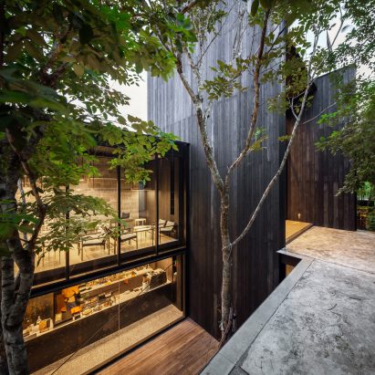 Thai firm IDIN Architects has slotted a studio it designed for itself into a narrow site in Bangkok and obscured it from view using tall trees and blackened wood. More