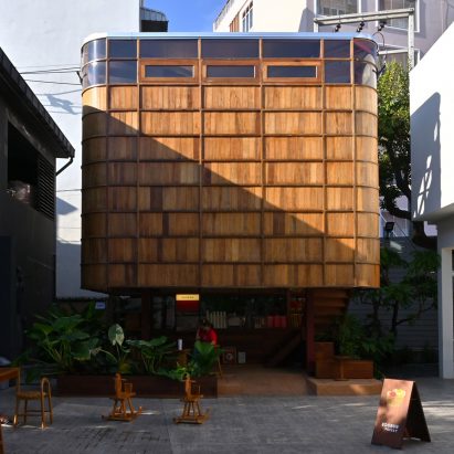 Reclaimed wood fashioned into panels covers this small cafe designed by CUP Scale Studio in the centre of Nakhon Sawan, Thailand. More
