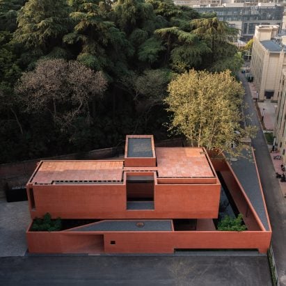 Angular cut-outs and courtyards break up the red-concrete structure of this monolithic exhibition centre in Nanjing, designed by Chinese studio Mix Architecture. More