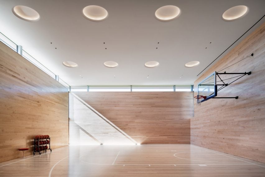 On the ground level, one finds multiple guest bedrooms, back-of-house spaces and an indoor basketball court.