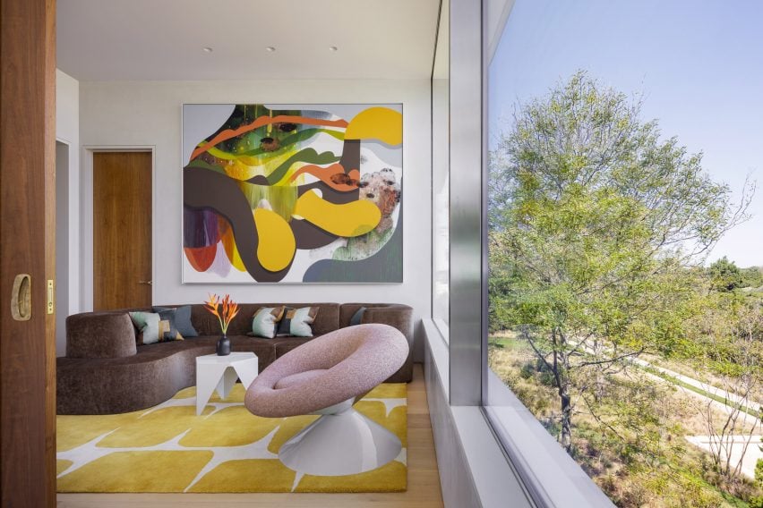 The extensive artwork includes a mural in the entryway by abstract artist Mig Perkins.